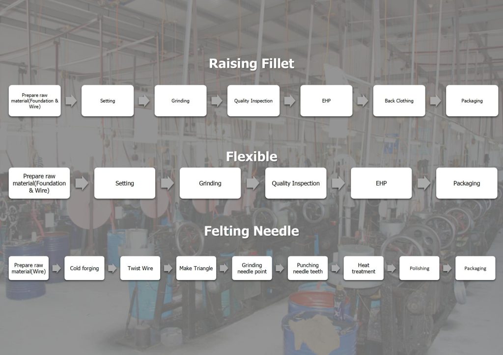 Our main products include the flexible card clothing, metallic card clothing, raising fillet, non-woven card clothing and felting needle.
